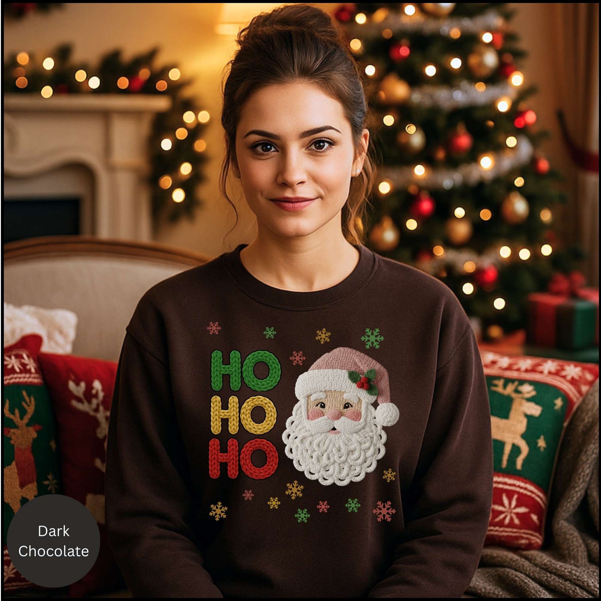 This HO HO HO Knit Santa Christmas Sweatshirt features an adorable vintage-style Santa face with a textured knit beard, rosy cheeks, and a soft pink hat β paired with chunky knit βHO HO HOβ lettering and colorful snowflakes.