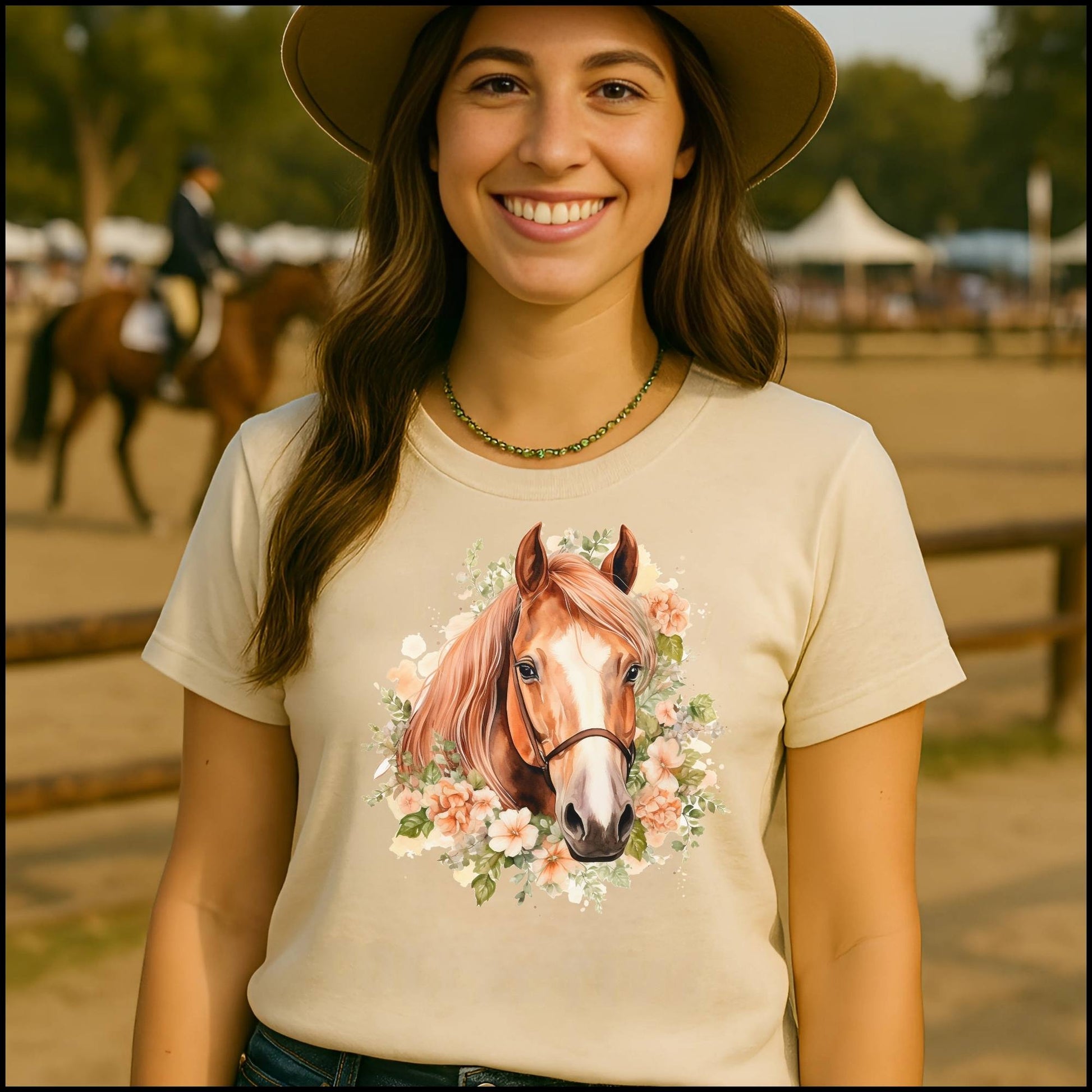This enchanting t-shirt features a beautifully illustrated chestnut horse with a soft, soulful gaze, surrounded by a dreamy halo of peach and cream. Perfect for anyone who loves to express their passion for horses and nature, this tee celebrates the beauty of equestrian life and is a must-have for animal lovers. Crafted for comfort, it’s ideal for casual outings, weekend adventures, or cozy nights in. Great for social gatherings, horse shows, and family events, it seamlessly fits into your wardrobe for any occasion. Whether gifting it for special celebrations like birthdays or holidays, or simply treating yourself, this tee will be a delightful addition to anyone’s collection.
