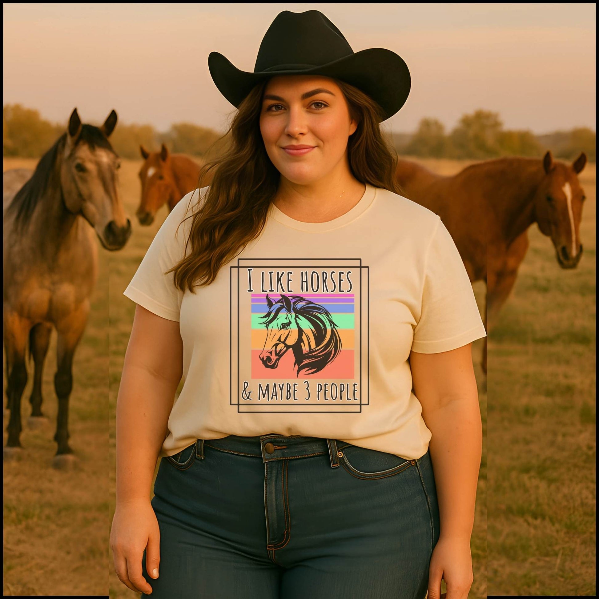 Show off your equestrian humor with our "I Like Horses & Maybe 3 People" graphic tee. Featuring a retro-inspired horse illustration with vibrant sunset colors, this shirt is perfect for horse lovers who prefer the company of their four-legged friends over most humans.