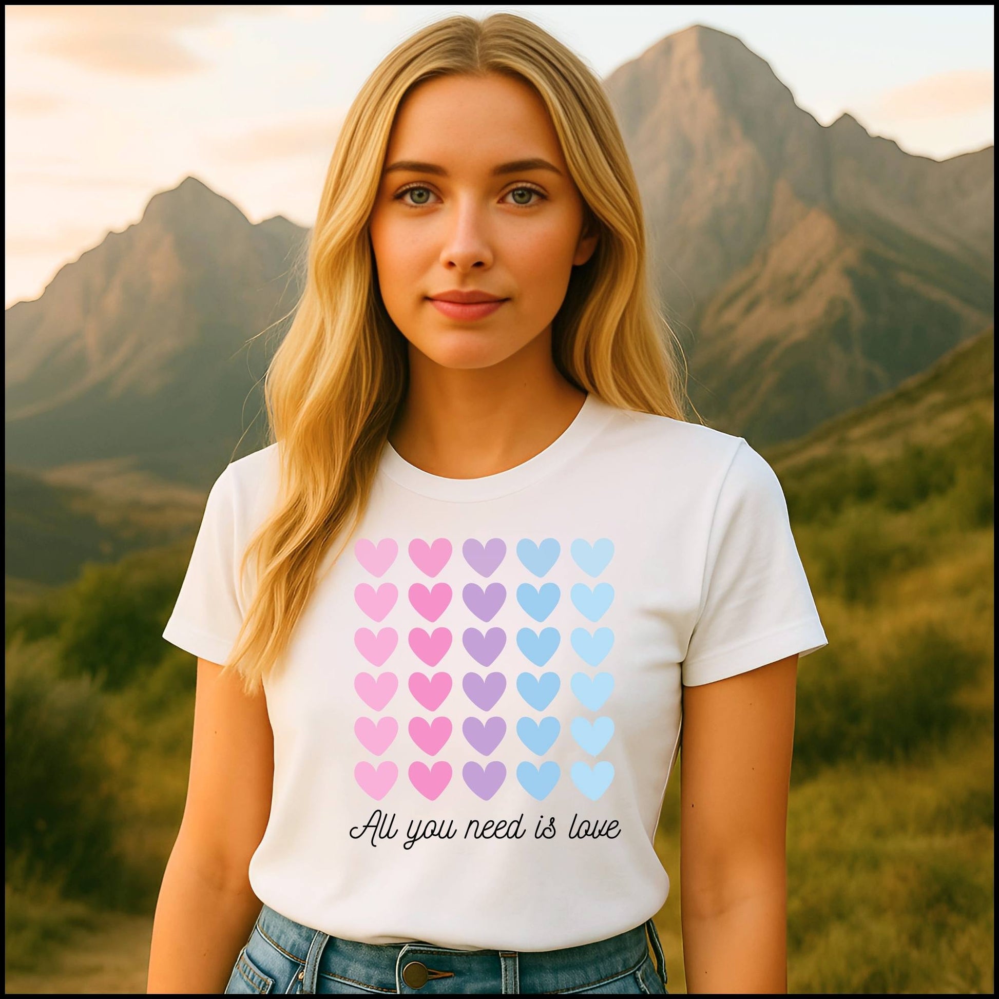 Celebrate the universal language of love with the Love in Every Shade Tee. Featuring a dreamy gradient of hearts in soft pinks, purples, and blues arranged in a tidy grid, this design radiates positivity, inclusion, and connection. The handwritten-style quote “All you need is love” adds a sentimental touch, making this shirt perfect for festivals, pride events, or everyday wear. Soft, breathable cotton and a flattering unisex fit make it as comfortable as it is meaningful.