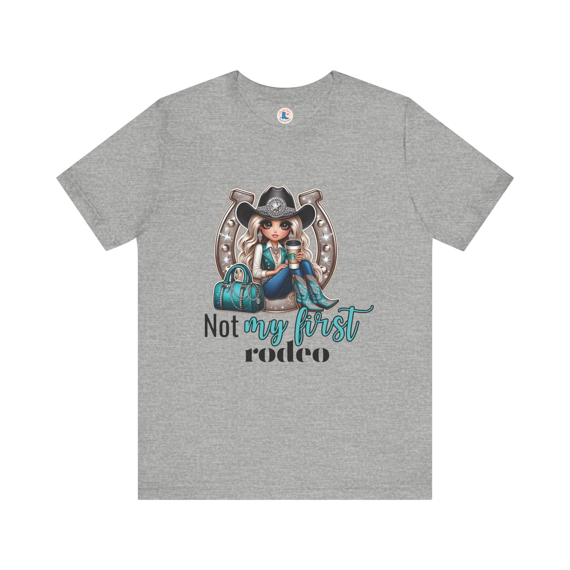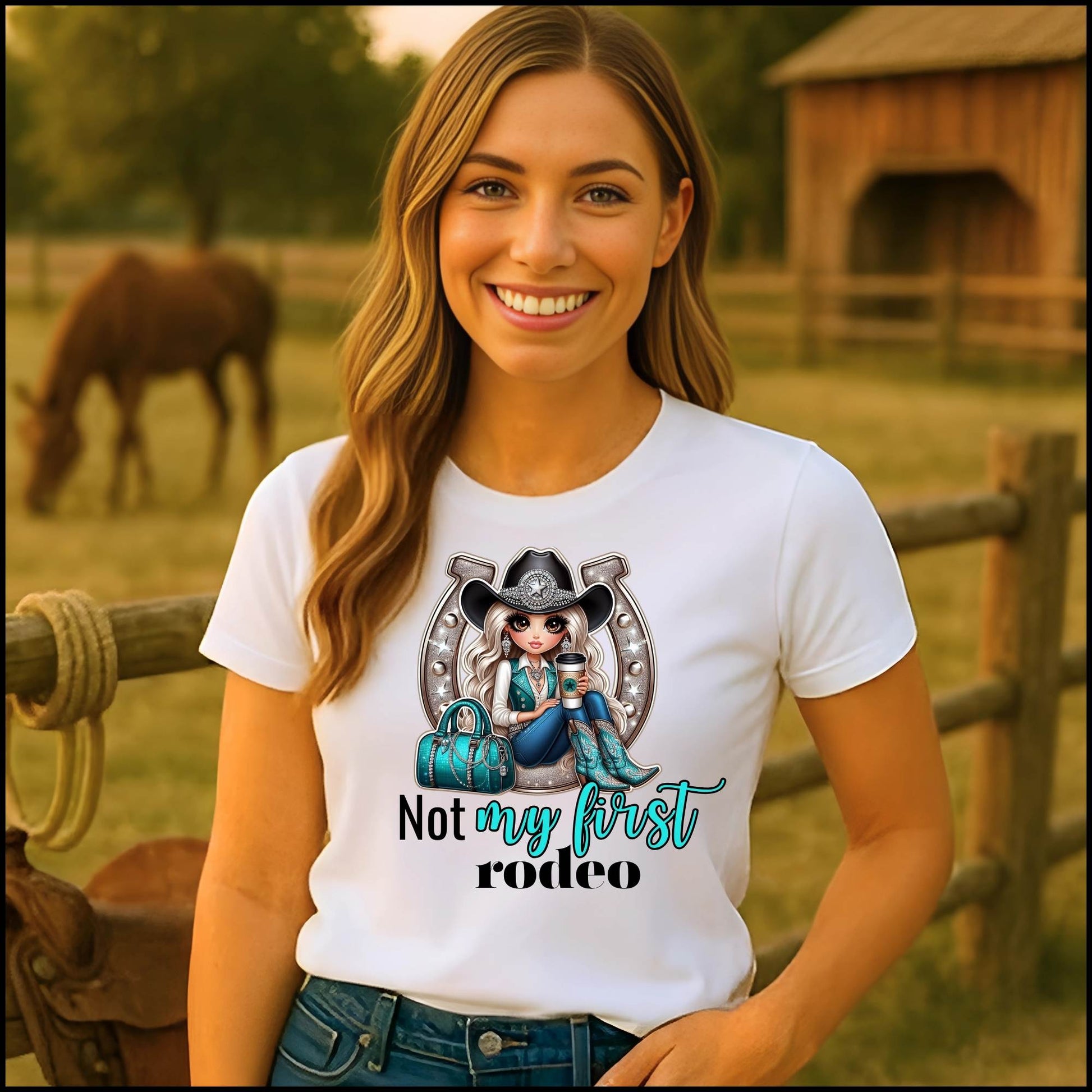 Saddle up in sass with the "Not My First Rodeo" Cowgirl Tee — a bold and playful graphic shirt for the fierce, coffee-fueled cowgirl who’s been through it all. Featuring a glam rodeo babe in turquoise boots and rhinestone flair, set against a silver horseshoe backdrop, this shirt is perfect for horse shows, country concerts, and everyday western slay.