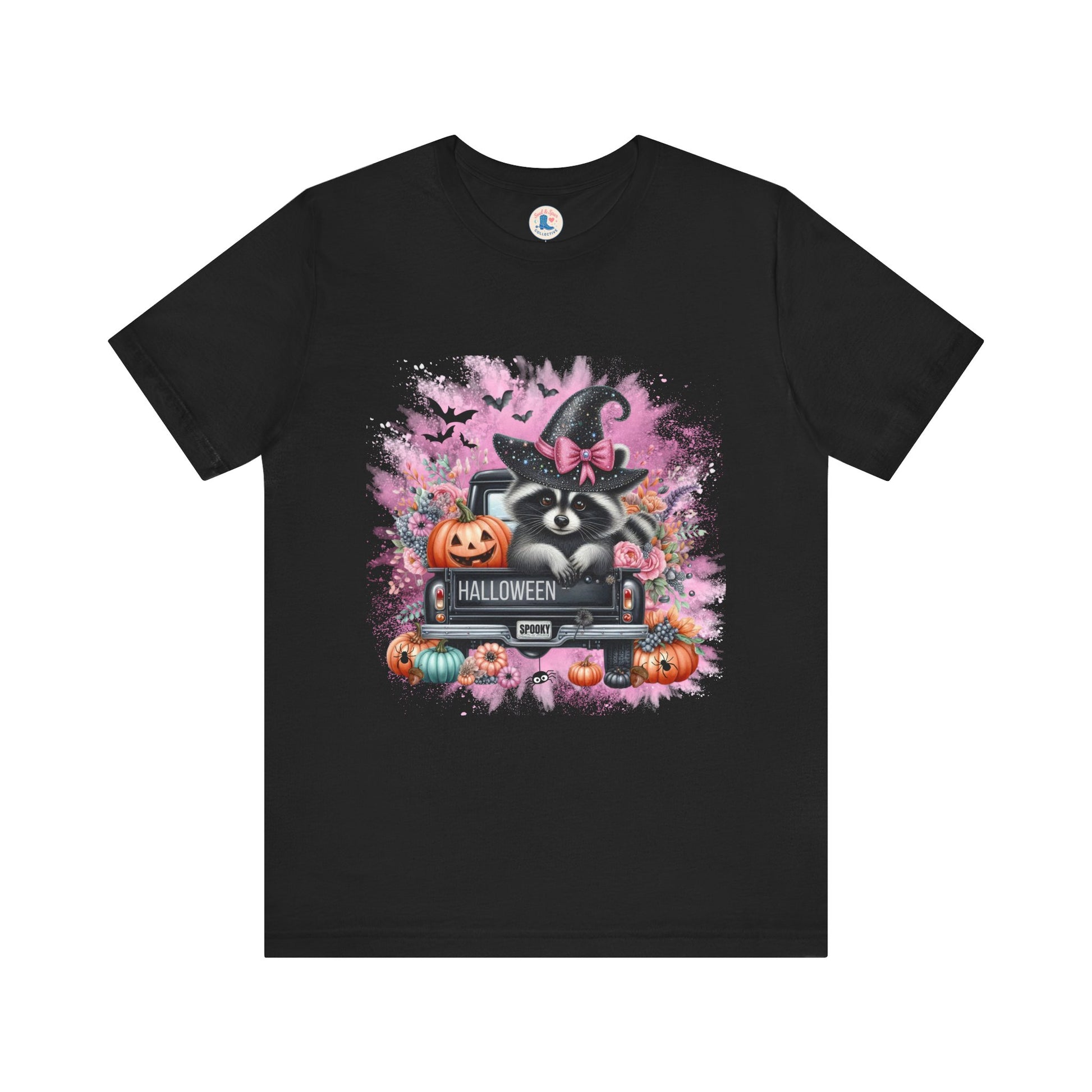 Add some mischievous charm to your spooky season with our Spooky Raccoon Halloween Truck Tee! This fun design features a playful raccoon in a witch hat riding in a vintage truck surrounded by pumpkins, bats, and festive florals — all set against a bold black tee for maximum Halloween vibes. Perfect for pumpkin patches, fall festivals, trick-or-treating, or cozy autumn nights, this shirt is equal parts cute and spooky.