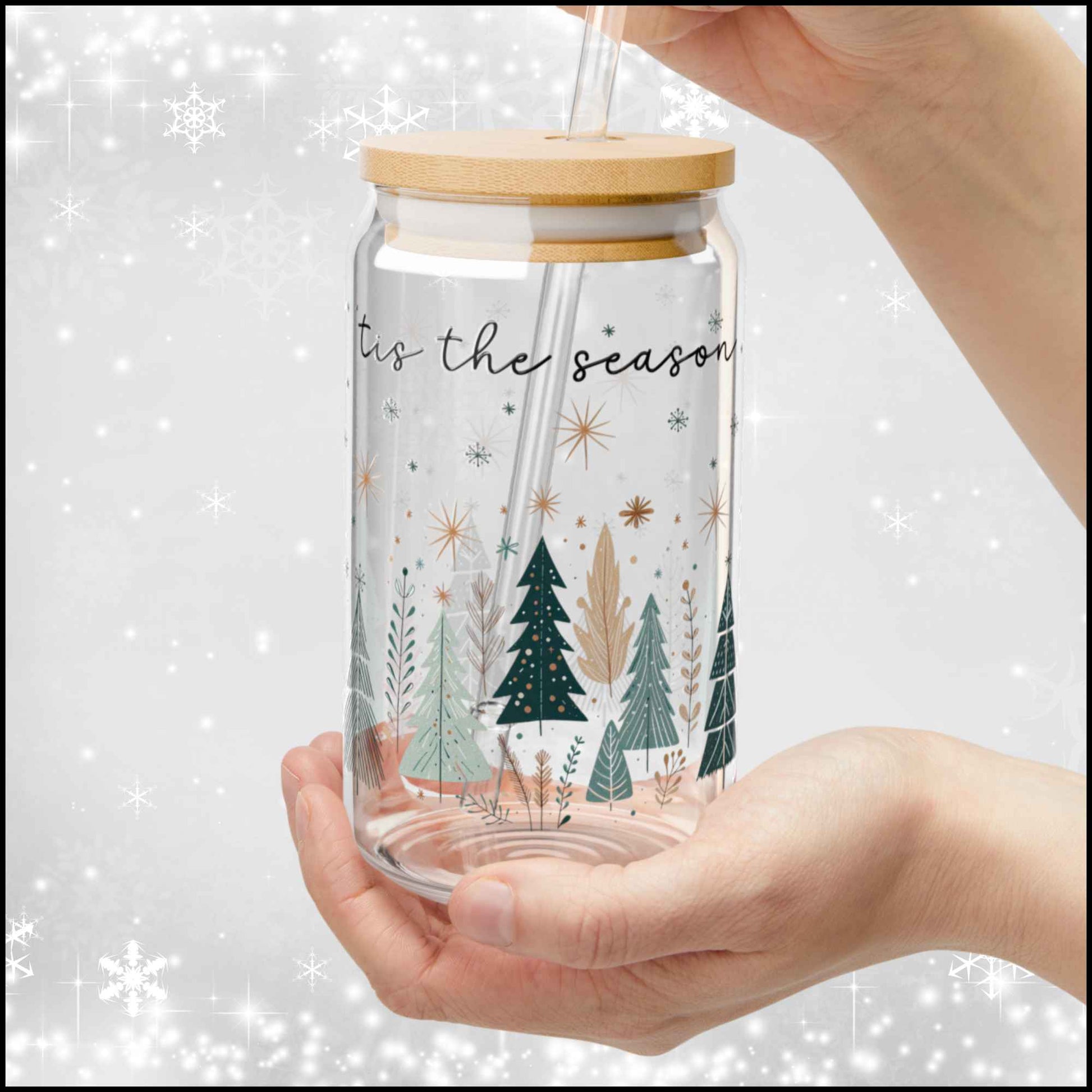 ’Tis the Season Winter Forest Glass Can – 16oz Christmas Tree Cup with Bamboo Lid & Straw | Neutral Holiday Aesthetic Drinkware