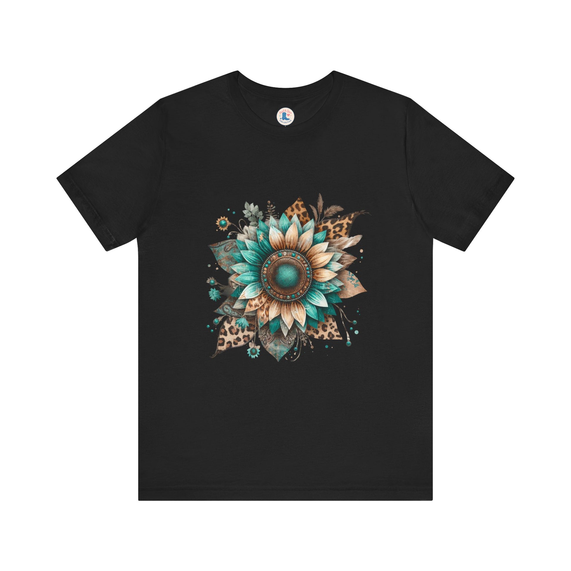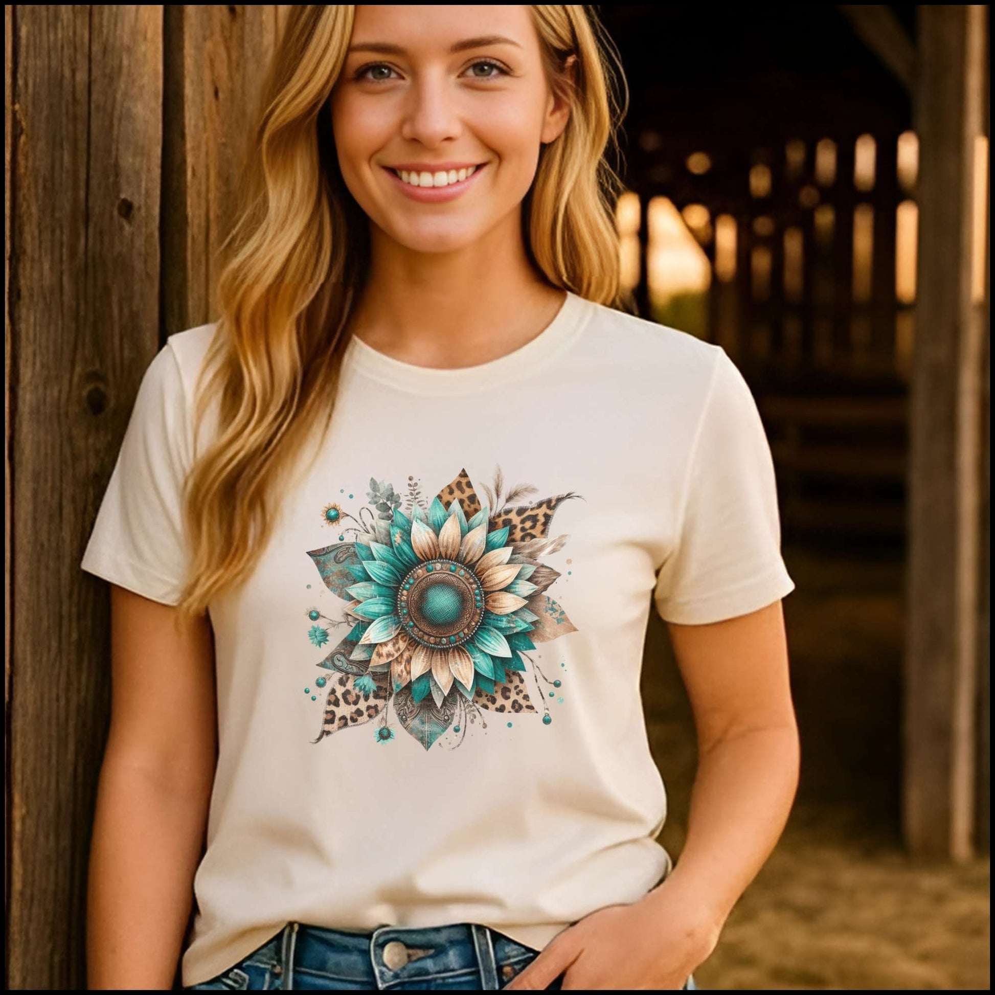 Turn heads and spark conversation with this bold and beautiful boho-inspired graphic tee. Centered on a radiant sunflower bursting with turquoise and cream petals, this design features layered textures of leopard print, tooled leather patterns, feathers, florals, and turquoise beadwork, all arranged in a mesmerizing collage behind the bloom.