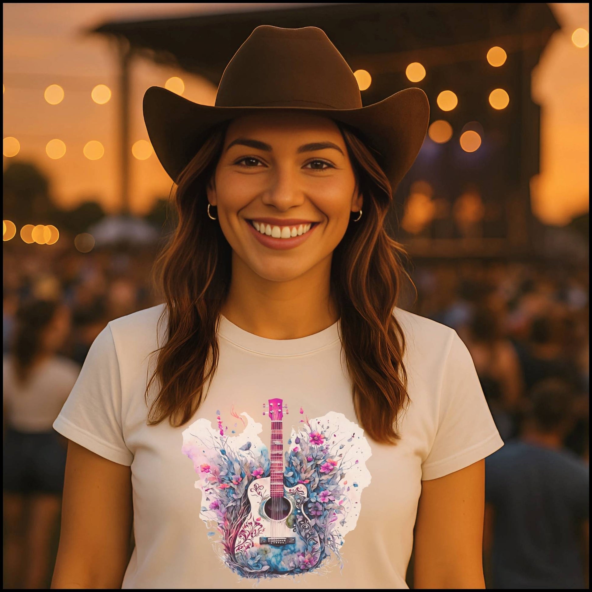 Bring your love of music and art to life with this dreamy boho-chic graphic tee. Featuring a beautifully illustrated acoustic guitar surrounded by blooming watercolor florals, this shirt is the perfect blend of creativity, soul, and free-spirited style.
