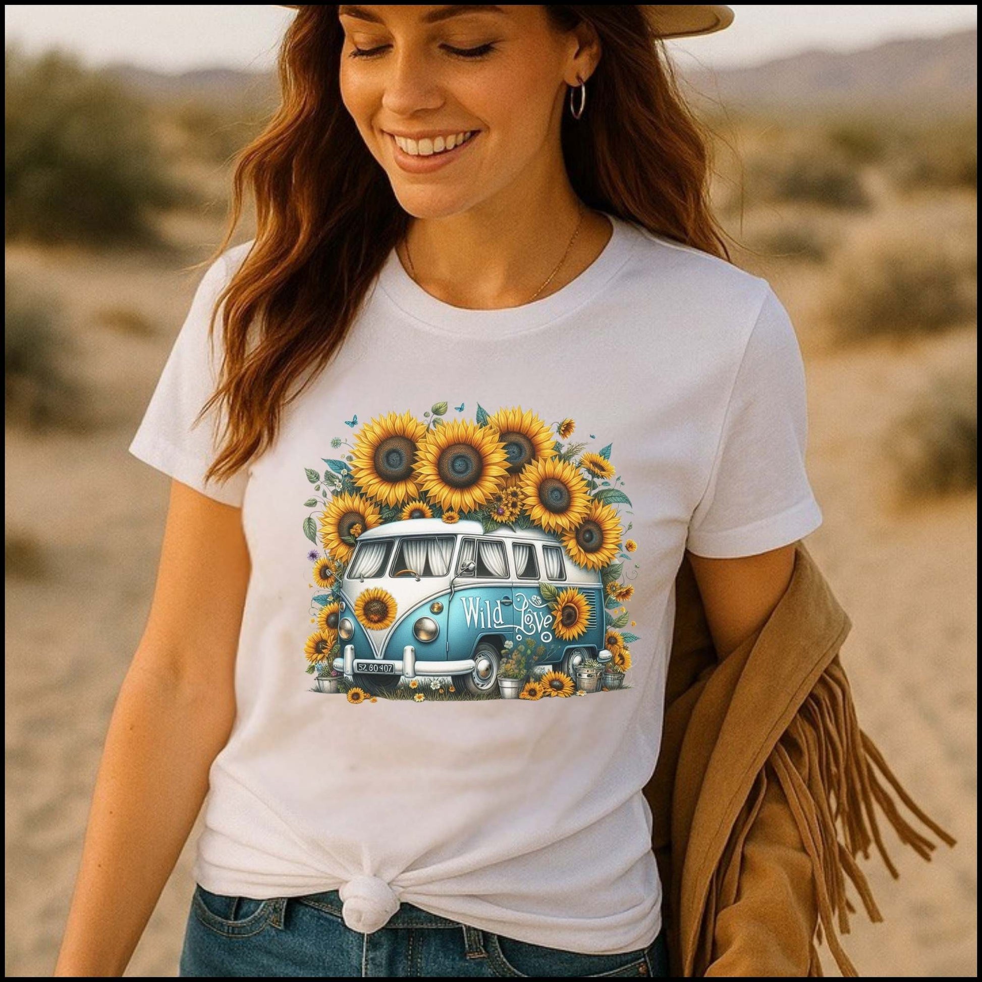 Hit the road with flower power in our Wild Love Sunflower Van Tee! This bold shirt features a retro teal camper van bursting through a sea of golden sunflowers, with whimsical “Wild Love” lettering painted on the side. It’s a nostalgic nod to free-spirited adventures, sunshine days, and boho soul.